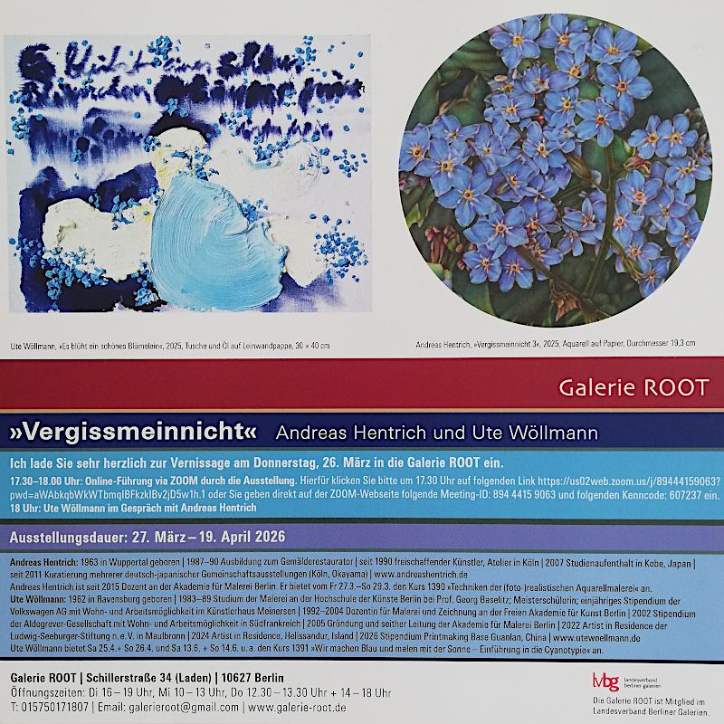 Im Mittelpunkt der Ausstellung steht die Auseinandersetzung mit Naturmotiven, Erinnerung und Wahrnehmung. Beide Künstler nähern sich dem Thema auf sehr unterschiedliche Weise: Während Andreas Hentrich in seinen fein ausgearbeiteten Aquarellen Pflanzen und Naturformen mit großer Präzision und Sensibilität untersucht, verbindet Ute Wöllmann in ihren Arbeiten malerische Gesten, Zeichnung und Schrift zu poetischen Bildkompositionen.
